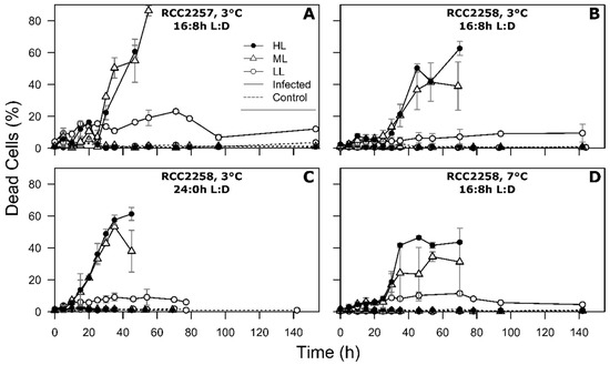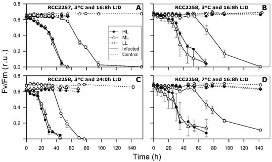 - Baudoux, A.C.; Brussaard, C.P.D. Influence of irradiance on virus-algal host interactions. J. Phycol. 2008, 44, 902–908. [Google Scholar] [CrossRef] [PubMed]