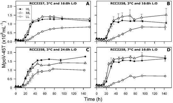Chicago/Turabian StylePiedade, Gonçalo J., Ella M. Wesdorp, Elena Montenegro-Borbolla, Douwe S. Maat, and Corina P. D. Brussaard. 2018. "Influence of Irradiance and Temperature on the Virus MpoV-45T Infecting the Arctic Picophytoplankter Micromonas polaris" Viruses 10, no. 12: 676. https://doi.org/10.3390/v10120676