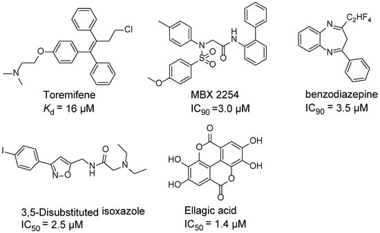 Ebola virus glycoprotein (GP) is the only viral surface protein and is solely responsible for receptor binding and mediating fusion of viral and host membranes during viral entry [15,16]. GP is composed of a heterodimer of GP1 and GP2 that forms a trimer. GP is considered a promising target for anti-Ebola drug development [8], as inhibitors could block viral entry into cells, which is the first step of virus replication. Antibody-based therapies work by blocking this step [17,18]. A few inhibitors, as listed in Figure 1, have been identified to have anti-EBOV activity, possibly via targeting GP, but none have been approved for therapeutics in humans or in clinical trials [9,19,20,21].
