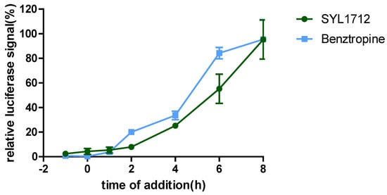 To explore the mechanism of action (MOA) of compound SYL1712 in inhibiting Ebola virus entry, time-of addition (TOA) experiments were performed following a previously published protocol using benztropine as a positive control, which was reported as an EBOV entry inhibitor by interfering with the GP-mediated fusion between virus membrane and host endosomal membrane [33,34]. The results (Figure 2) show that both benztropine and compound SYL1712 similarly blocked viral entry well within one hour, and gradually lost the activity afterward, suggesting that compound SYL1712, like benztropine, blocks Ebola GP-mediated viral entry in the endosome.