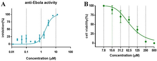 The anti-virus effect of compound SYL1712 was further evaluated and validated in HeLa cells against infectious EBOV infection in a BSL-4 facility. The high-content imaging detection method with Ebola Mayinga isolate was used for this study [27]. Compound SYL1712 was effective at blocking the replication of infectious EBOV with an IC50 of 1.99 μM (Figure 3A), consistent with the results from the pseudovirus entry assay above. Since the CC50 of compound SYL1712 was 74.08 μM with HeLa cells (Figure 3B), the selective index (SI) of compound SYL1712 was 37.2.