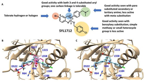 Structure activity relationship (SAR) of diarylquinoline compounds against EBOV (A) Summary of the SAR analysis the diarylquinoline compounds as Ebola virus entry inhibitors. (B,C) Predicted binding mode of SYL1712 with Ebola glycoprotein by molecular docking (PDB code: 5JQ7). (B) Superposition of SYL1712 (cyan) with toremifene (pink) shows similar binding orientations at the interface between GP1 and GP2; (C) SYL1712 (cyan) forms both hydrophobic interactions (V66, Y517, L558, L184 and L186) and electrostatic interactions (D522) with EBOV GP (C).