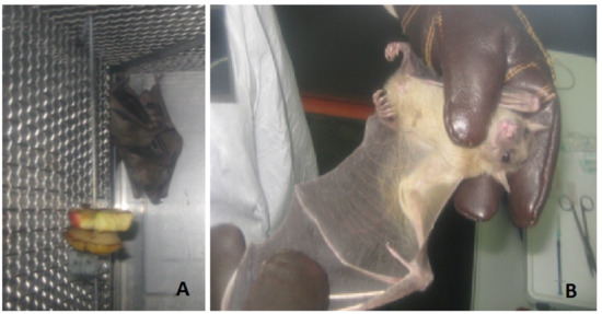 Handling of the bats during the immunization experiment. (A) Two bats kept together in one cage; (B) preparation of the bat for collection of blood sample. Due to the calm temperament of these animals, the sampling could be done without general anesthesia.