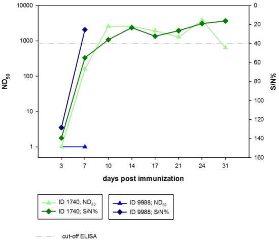 Neutralizing doses of 50% (ND50) (triangle) and the percentage of inhibition (S/N%) (diamond) detected in the ID Screen® RVFV competition multi-species ELISA (ID Vet, Montpellier, France) are depicted for ID 1740 (green) and ID 9988 (blue).