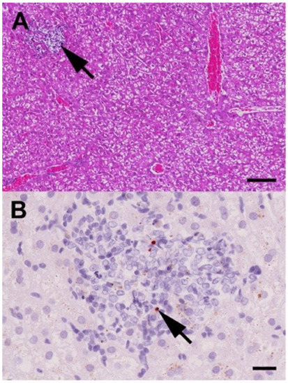 Histopathological findings in the liver of a Rousettus aegyptiacus fruit bat immunized with the MP-12 vaccine strain at day seven post immunization. (A) Histopathology shows few, randomly distributed foci of hepatocellular necrosis and loss with macrophage and lymphocyte infiltration (arrow). Furthermore, the hepatocytes display moderate, coalescing to diffuse, floccular cytoplasmic vacuolization, interpreted as a species-specific, relatively high level of glycogen storage. Hematoxylin-eosin. Bar = 100 μm; (B) Immunohistochemistry for Rift Valley fever phlebovirus (RVFV) Gc antigen reveals minor amounts of intra- and extracellular, strongly immunoreactive granula within the lesions (arrow), interpreted as debris remaining after virus-induced hepatocellular death. Immunohistochemistry, monoclonal mouse anti-RVFV Gc-protein antibody, avidin-biotin-peroxidase-complex method, 3-amino-9-ethyl-carbazol chromogen (red), hematoxylin counterstain (blue). Bar = 20 μm.