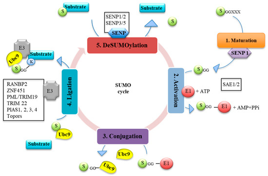 - Gareau, J.R.; Lima, C.D. The SUMO pathway: Emerging mechanisms that shape specificity, conjugation and recognition. Nat. Rev. Mol. Cell. Biol. 2010, 11, 861–871. [Google Scholar] [CrossRef]