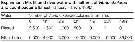 Effect of water from the Junma river on Vibrio cholerae bacteria (data from [15]). It is debated if the antibacterial effect was due to phages or other agents present in the river water [16].