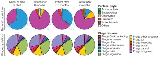 Dynamics of bacterial (top) and phage (bottom) populations in a C. difficile patient successfully treated by fecal microbiota transplantation (FMT). Data adapted from [30].