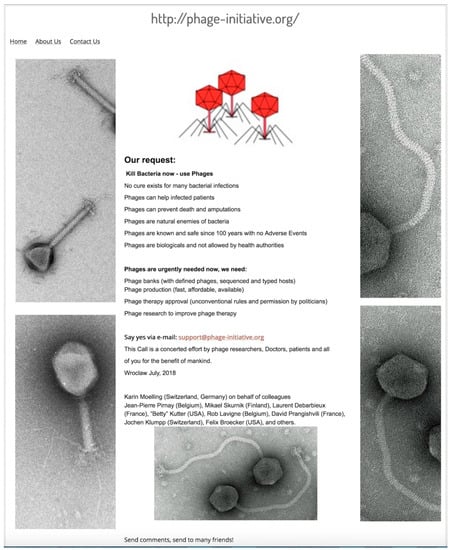 This proposal was initiated during the Viruses of Microbes workshop in Wroclaw, 2018, by a consortium of several phage researchers, asking all participants for support of phage therapy. Around two hundred participants, including many phage experts, agreed. The names of the consortium members are listed on the petition page shown below (Figure 4). Additional information can be found on www.phage-initiative.org, including references about ongoing research under “About Us”. To support the proposal, please send an e-mail saying “yes” to support@phage-initiative.org.