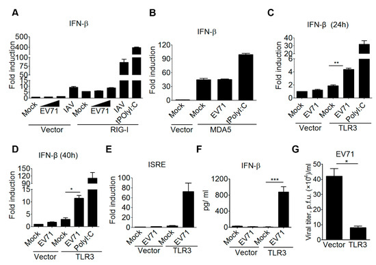 TLR3 detects EV-A71 infection to trigger type I IFN-mediated antiviral immunity. (A) HEK293 cells were transfected with an IFN-β luciferase reporter plasmid, plus either a control vector (pcDNA6.0) or a Flag-tagged RIG-I construct. After 24 h, the transfected cells were either left untreated, treated with poly(I:C) (0.2 µg/mL) transfection, or infected with an influenza A virus (IAV/WSN/33, 50 HA/well) or EV-A71 (4643 strain, MOI, 0.1 and 1). After another 40 h, the treated cells were harvested to analyze the IFN-β promoter activity. The EV-A71 used for most experiments was the 4643 strain, unless otherwise indicated. (B) Similar to Panel A, His-tagged MDA-5 was used to assess the IFN-β promoter activity in transfected HEK293 cells upon EV-A71 (MOI, 0.1) infection. (C–E) HEK293 cells were transfected with either a control vector or a Flag-tagged TLR3 plasmid with an IFN-β (C,D) or an ISRE (E) luciferase reporter plasmid. After 24 h, the transfected cells were either left untreated, treated with poly(I:C) (50 µg/mL), or infected with EV-A71 (MOI, 0.1). After another 24 h (C) or 40 h (D,E), the treated cells were harvested for luciferase assays. (F) HEK293 cells were transfected with either a control vector or Flag-tagged TLR3. After 24 h, the transfected cells were either left untreated or infected with EV-A71 (MOI, 0.1). After another 40 h, the supernatants were collected for ELISA. (G) HEK293T cells were transfected with a control vector or Flag-tagged TLR3 for 48 h, and then were infected with EV-A71 (MOI, 1) for 20 h. Viral titers in the supernatants were measured using plaque assays. * p < 0.05, ** p < 0.005, and *** p < 0.0005, Student’s t-test. Data are representative of at least two or three independent experiments.