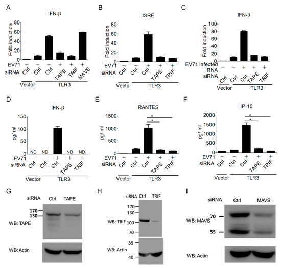TLR3 downstream signaling is essential for triggering a type I IFN response to EV-A71 infection. (A,B) HEK293 cells were treated with the indicated siRNAs targeting Trif, TAPE, and MAVS for 48 h, and the cells were subsequently transfected with Flag-tagged TLR3 and an IFN-β (A) or ISRE (B) reporter plasmid. These cells were infected with EV-A71 (MOI, 0.1) for 40 h, and were then harvested for luciferase assays. (C) Like panel A, EV-A71-infected RNA was used to stimulate cells by DOTAP lipofection, and then the IFN-β promoter activity was measured using luciferase assays. (E,F) HEK293 cells were treated as in Panel B, with no transfection of the ISRE reporter plasmid. Supernatants from the treated cells were measured using ELISA for the production of IFN-β (D), RANTES (E), and IP-10 (F). (G–I) Western blot analyses of endogenous TAPE (G), TRIF (H), and MAVS (I) in HEK293 cells treated with indicated siRNAs or control siRNA. ND means “not detected.” * p < 0.05, Student’s t-test. Data are representative of at least two or three independent experiments.
