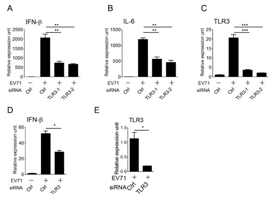 Antigen-presenting cells, like macrophages and dendritic cells, play an important role in the innate immune defense against viral infection, and are also linked to the activation of adaptive immunity. These cells express endogenous TLR3 and other viral nucleic acid sensors to sense viral nucleic acids during viral infection, thereby triggering type I IFN antiviral responses. After demonstrating the involvement of TLR3 in detecting EV-A71 infection in the reconstituted HEK293 cells, we attempted to further confirm the role of endogenous TLR3 in primary antigen-presenting cells in the detection of EV-A71 infection to trigger type I IFN activation. To this purpose, the small interfering RNA approach was used for the loss-of-function analysis. Mouse bone marrow-derived macrophages (BMMs) were first transfected with the control and two sets of TLR3 siRNAs, and transfected BMMs were infected with EV-A71 for 6 hours and then subjected to quantitative real-time PCR (qPCR). Our results showed that TLR3 knockdown in BMMs significantly impaired the expression of IFN-β and IL-6 cytokine genes upon EV-A71 infection (Figure 4A,B). The silencing effect of TLR3 on mouse BMMs was confirmed by the decrease in the TLR3 mRNA level even though TLR3, as one of ISGs, was also upregulated upon EV-A71 infection (Figure 4C). Likewise, silencing of TLR3 in human monocyte-derived dendritic cells (MoDCs) led to lower IFN-β and TLR3 mRNA expression in response to EV-A71 infection (Figure 4D,E). Together, these data support a critical role for TLR3 in primary innate immune cells to induce type I IFNs upon detecting EV-A71 infection.
