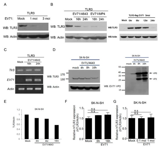 The TLR3 protein level is decreased upon EV-A71 infection. (A) HEK293 cells transfected with Flag-tagged TLR3 were left untreated or infected with EV-A71 (MOI, 1 and 3). After 24 h, the treated cells were harvested for the Western blot analysis of TLR3 protein levels. (B) Similar to panel A, EV-A71 (4643 strain, MOI, 3) and EV-A71 (MP4 strain, MOI, 1) were used to infect TLR3-transfected HEK293 cells for the indicated times. These cells were then harvested for the Western blot analysis of TLR3. (C) Like Panel B, the treated cells were harvested at the indicated times to analyze the mRNA levels of Tlr3, EV-A71, and β-Actin by RT-PCR. (D,E) SK-N-SH cells were left untreated or infected with EV-A71 (4643 strain, MOI, 0.2) for 4 h, 8h, and 16 h, and the cells were harvested for the Western blot analysis of the endogenous TLR3 protein level. (F) SK-N-SH cells were left untreated or infected with EV-A71 (4643 strain, MOI, 0.1), and the cells were harvested at the indicated times (6 h and 16 h) to analyze the mRNA levels of Tlr3 and β-Actin by qRT-PCR. (G) SK-N-SH cells were left untreated or infected with EV-A71 (4643 strain, MOI, 0.1 and 1) for 6 h, and the cells were harvested to analyze the mRNA levels of Tlr3 and β-Actin using qRT-PCR. NS stands for “not significant” (Student’s t-test). Data are representative of at least two or three independent experiments.