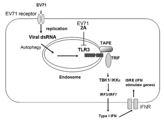 A model for the detection of EV-A71 infection by TLR3. Upon infection into host cells, EV-A71 generates dsRNA during viral replication. Endosomal TLR3 in host cells detects EV-A71 dsRNA, possibly via autophagy, to recruit the adaptor TRIF and TAPE, which further trigger signaling pathways to IFN-β activation and subsequent expression of IFN-stimulated genes (ISGs). To promote EV-A71 survival in host cells, EV-A71 uses its 2A protease to target TLR3 for degradation to counteract type I IFN-mediated antiviral responses.