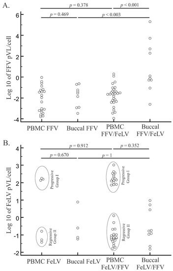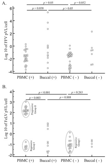 Distribution of feline foamy virus (FFV) and feline leukemia virus (FeLV) log10 proviral loads (pVLs) in blood and oral specimens. FFV (A) and FeLV (B) pVLs were measured by quantitative PCR of specimens with nested PCR-positive and -negative test results from domestic cats from Brazil. PCR-positive and -negative cat samples in peripheral blood mononuclear cell (PBMC) or buccal specimens are presented on the x-axis. Horizontal lines above each graph depict statistical comparisons between the pVL of specific animal groups or specimen types (Student’s t tests) with associated probability (p) values shown. Ellipses in (B) represent different cat groups of FeLV infection outcomes (regressive or progressive).