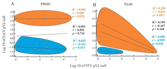 Spearman correlation analysis between feline leukemia virus (FeLV) and feline foamy virus (FFV) log10 proviral loads (pVLs) on blood and oral specimens. Correlations were tested in both peripheral blood mononuclear cells (PBMCs) (A) and buccal swab specimens (B). Vertical and horizontal axes represent FeLV and FFV pVLs, respectively. Each open circle represents a sample for which pVL was measured for both viruses. Orange and blue ellipsoids represent FeLV progressive and regressive individuals, respectively. Correlation coefficients (R2) and probabilities (p-values) are provided for each group (progressive and regressive) and for all samples together. They are represented in the graph by lines. Dotted lines represent the correlation among all samples, both progressive and regressive. For PBMCs, progressive and regressive cats had FFV and FeLV pVLs with weak correlation (R2 < 0.001, p = 0.970 and R2 = 0.025, p = 0.474, respectively). pVLs in buccal swab samples of progressive and regressive cats were inversely correlated (R2 = 0.399, p = 0.093 and R2 = 0.998, p = 0.028, respectively).