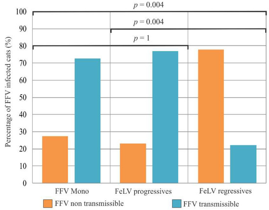 The percentage of potentially transmissible FFV with detectable pVLs in buccal swabs in monoinfected cats (72.7%) was very similar to that in FeLV progressive cats (76.9%) (Figure 4). The opposite was found when comparing FFV-monoinfected cats and FeLV regressives (p = 0.004).