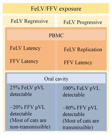 Hypothetical pathway to progressive or regressive outcomes via dual infection with feline foamy virus (FFV) and feline leukaemia virus (FeLV) and potentially active viral replication measured by proviral load (pVL). FeLV progressive and regressive outcome determined by PBMC tissue (blood) pVLs were correlated to different FFV and FeLV pVL patterns of detection in the oral cavity.
