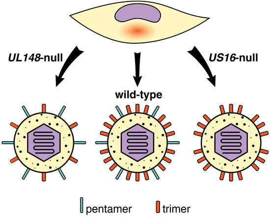- Jiang, X.J.; Adler, B.; Sampaio, K.L.; Digel, M.; Jahn, G.; Ettischer, N.; Stierhof, Y.D.; Scrivano, L.; Koszinowski, U.; Mach, M.; et al. UL74 of human cytomegalovirus contributes to virus release by promoting secondary envelopment of virions. J. Virol. 2008, 82, 2802–2812. [Google Scholar] [CrossRef]