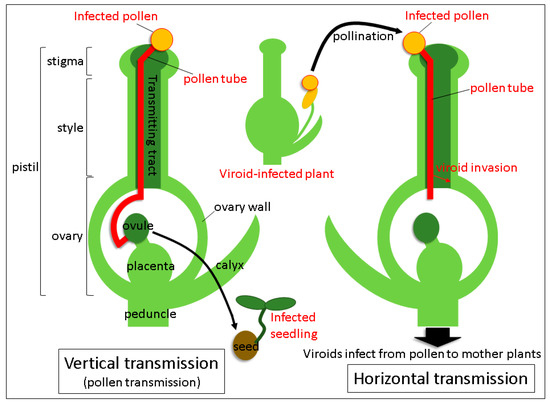 Viroids mainly spread mechanical means: Through infected plant sap, grafting of contaminated scions, plant materials propagated vegetatively from the infected plant and dispersal of infected seeds and pollen. Transmission routes via seeds and pollen are the major ways of infection propagation from parental plants to their progeny and distribution among individuals. The term “seed transmission” means the passage of the pathogen through seeds to seedlings and plants in the next generation. Hence, it is also known as vertical transmission (Figure 1) [6,7,8,9]. Vertical transmission plays an important role in the spread and survival of viroids, as well as viruses. Vertical transmission of viroids has long been known [2,10,11], but much attention has not been paid to this phenomenon until the end of 20th century. Importance of seed transmission of viroids, especially in pospiviroid species, has been highlighted in the early 21st century, when the global distribution of pospiviroid-infected seeds and seed materials became apparent in vegetables and ornamental plants, which increased the risk of diffusion of pospiviroid-infected seeds materials in international trade [12]. The phenomenon of a horizontal transmission closely connected to a vertical transmission, occurs when the pathogen is transmitted to other individuals via pollination with infected pollen (Figure 1) [13,14]. Many plant viruses and viroids are known to spread horizontally or even vertically through pollen in experimental conditions, but for the viroids at least, the effects of these types of transmission on actual plant cultivation have not yet been clearly understood. Recent experimental results suggested that horizontal transmission not only causes spreading of the viroid to the surrounding host of the same species, but also provides a chance to propagate in other host species. Here, we review vertical and horizontal modes of transmission of viroids through pollen, focusing mainly on the recent progress in the histopathological analysis of pospiviroids. For more general aspects of viroid seed and pollen infection, including their economic importance, please refer to the review by Hammond [2].