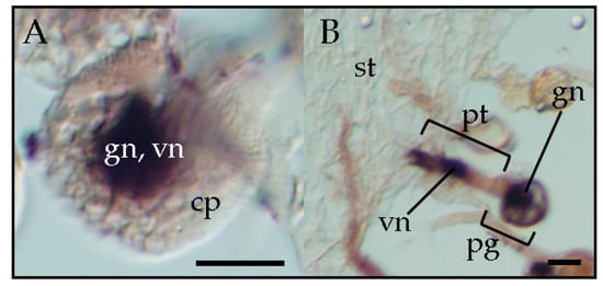 In situ hybridization shows the presence of potato spindle tuber viroid (PSTVd) in the generative nucleus and vegetative nucleus of, respectively, infected mature pollen grains (A) and infected germinating pollen grains on healthy stigma (B) in PSTVd-infected petunia. cp, cytoplasm; gn, generative nucleus; pg, pollen grain; pt, pollen tube; st, stigma; vn, vegetative nucleus. Scale bars = 50 μm.