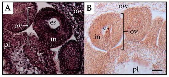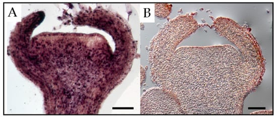 PSTVd was detected in all floral parts, such as the sepal, petal, stamen, and pistil of tomato plants [41]. In floral organs of petunia, PSTVd was present in the reproductive tissues of infected plants before embryogenesis [22]. At the floral shoot stage, PSTVd was present in all tissues except for several layers of cells that resemble shoot apical meristems (Figure 3). At the next stage, the viroid was detected in the carpel, petal primordia, stamen primordia, and sepal, but not in ovary primordia. Although PSTVd was absent from the ovule primordium at this stage, it was observed in early developing ovules at the subsequent stage. Finally, PSTVd was present in the ovary wall, placenta, and ovules of PSTVd-infected petunia plants at the flower opening stage (Figure 4). Similarly, the time course in situ hybridization analysis of PSTVd distribution in ovules during different developmental stages leading to seed formation has been performed in ovary parts using PSTVd-infected petunia pollinated with uninfected petunia pollens. This revealed that PSTVd was already distributed in the integuments and parenchyma following the placenta infection at the early stage of embryogenesis and then, at the next stage, PSTVd was observed in the developing endosperm and embryo, and eventually, in the matured seed. Thus, PSTVd strong signals were detected only in the embryo tissue.