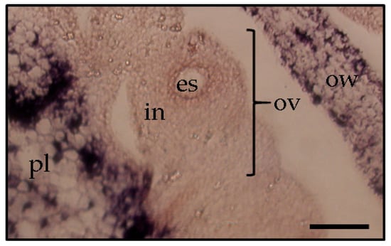 In situ hybridization shows the presence of potato spindle tuber viroid in the ovary wall (ov) and placenta (pl), but not the ovule (ov), which comprise the embryo sac (es) and integument (in), respectively, in a flower of an infected eggplant (Solanum melongena) at the flower opening stage. Scale bars = 100 μm.