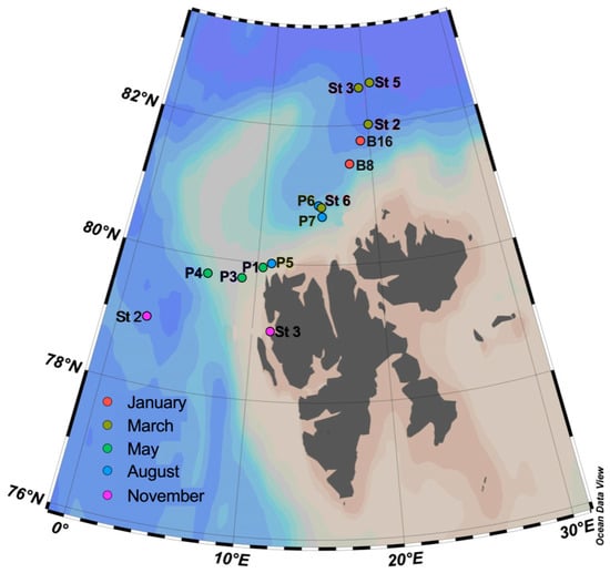 - Marquardt, M.; Vader, A.; Stübner, E.I.; Reigstad, M.; Gabrielsen, T.M. Strong seasonality of marine microbial eukaryotes in a high-arctic fjord (Isfjorden, in west Spitsbergen, Norway). Appl. Environ. Microbiol. 2016, 82, 1868. [Google Scholar] [CrossRef]