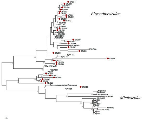 - Hingamp, P.; Grimsley, N.; Acinas, S.G.; Clerissi, C.; Subirana, L.; Poulain, J.; Ferrera, I.; Sarmento, H.; Villar, E.; Lima-Mendez, G.; et al. Exploring nucleo-cytoplasmic large DNA viruses in tara oceans microbial metagenomes. ISME J. 2013, 7, 1678–1695. [Google Scholar] [CrossRef] [PubMed]