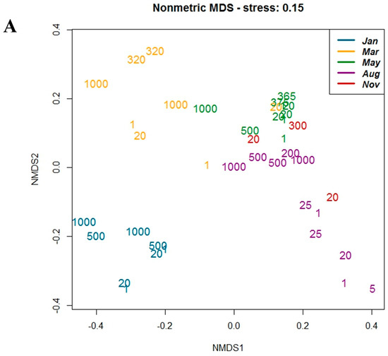 Nonmetric multidimensional scaling (NMDS) analysis of OTU diversity for (A) g23 and (B) mcp genes. Numbers indicate sampling depth (m), and colors indicate sampling month. Samples clustered together based on similarity in OTU composition (Bray–Curtis dissimilarity), and the axes indicate separation between samples.