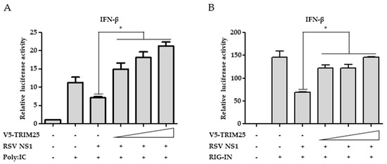 Ablation of interferon-β promoter suppressive effect of NS1 by ectopic expression of TRIM25. (A,B) RSV NS1 was expressed with increasing amount of TRIM25 in HEK293T cells. To induce interferon-β promotor activity, low molecular weight polyI:C (A) or RIG-IN (B) were transfected at the same time as indicated. Interferon (IFN)-β promoter firefly luciferase and Thymidine kinase (TK) renilla luciferase reporter plasmids were co-transfected. Interferon-promoter activities were analyzed by luciferase assays. Data were presented as the mean ± SEM. * p < 0.05. The experiments were repeated at least three times. The results show the most representative data from a single experiment conducted in triplicate.