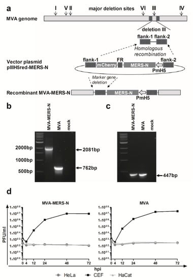 Generation and characterization of recombinant Modified Vaccinia virus Ankara expressing the Middle East respiratory syndrome coronavirus N protein (MVA-MERS-N); (a) Schematic diagram of the MVA genome indicating the major deletion sites I-VI on the top. Flank-1 and flank-2 refer to MVA DNA sequences adjacent to corresponding insertion site. Deletion III was used to insert MERS-N encoding gene sequences under the transcriptional control of the vaccinia virus promoter PmH5. Repetitive sequences (FR) were designed to remove the mCherry marker by intragenomic homologous recombination (marker gene deletion); (b,c) PCR analyses of genomic viral DNA using oligonucleotide primers to confirm the correct insertion of recombinant MERS-N gene into deletion III (b), and the genetic integrity of the MVA genome for the C7L gene locus (c); (d) Multi-step growth analysis of recombinant MVA-MERS-N and non-recombinant MVA (MVA); Chicken embryo fibroblasts (CEF) and human HaCat or HeLa cells were infected at a multiplicity of infection (MOI) of 0.05 with MVA-MERS-N or MVA. Infected cells were collected at different time points after infection and titrated on CEF cells.