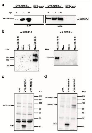 Analysis of recombinant MVA-MERS proteins; (a) Western Blot analysis of MERS-CoV N protein produced in CEF or HaCat cells. Lysates from cells infected with recombinant MVA (MVA-MERS-N, MVA-MERS-S) or non-recombinant MVA (MVA) at a MOI of five, or from non-infected cells (mock) were prepared at eight, 12, or 24 hpi. Proteins were analyzed by immunoblotting with a monoclonal anti-MERS-N antibody; (b–d) Western Blot analysis of MERS-CoV N and S proteins produced in CEF. Total cell extracts from CEF infected with recombinant MVA (MVA-MERS-N, MVA-MERS-S) or non-recombinant MVA (MVA) at a MOI of five, or from non-infected cells (mock) were prepared at 24 hpi. Cell lysates and proteins were tested by immunoblotting using monoclonal anti MERS-N and anti MERS-S antibody (b) or polyclonal sera from MERS-CoV infected rabbits (c) or cynomolgus macaques (d). Arrows indicate the N- or S-specific protein bands.