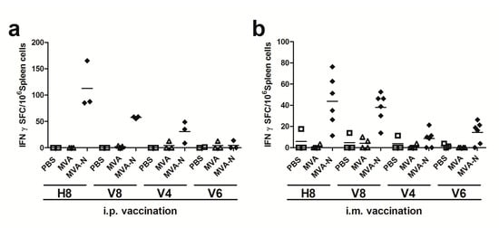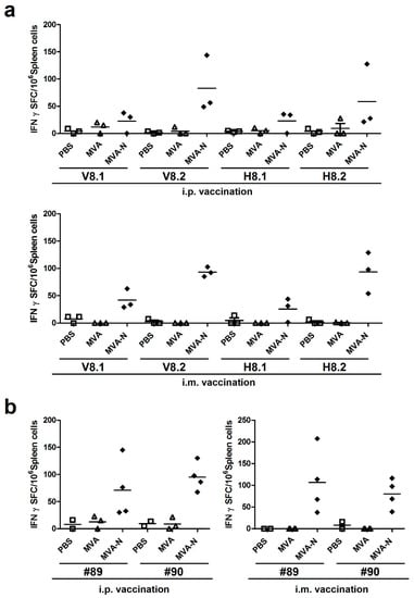 T cell responses against coronaviruses are known to be long lived and mostly target the more conserved CoV internal structural N protein. However, information on MERS-CoV N antigen-specific T cell specificities is still limited. Thus, we aimed first to identify N polypeptide-specific T cell epitopes in BALB/c mice immunized twice with recombinant virus MVA-MERS-N or non-recombinant MVA as a control via the intraperitoneal and intramuscular routes. Eight days after the final immunization, splenocytes were prepared and the purified CD4+ and CD8+ T cells were restimulated in vitro with overlapping peptides corresponding to the N protein. Overlapping peptides were pooled using a two-dimensional, pooled-peptide matrix system (Table S1) and screened by IFN-γ ELISPOT. The stimulation of splenoctyes from MVA-MERS-N immunized mice with the peptides from 16 out of the total 18 peptide pools did not result in the detection of IFN-γ producing T cells above background numbers obtained with splenocytes from mock or MVA-control vaccinated animals. Stimulation with the peptides from pools H8 (n = 10) and V8 (n = 10) as well as the use of the vaccinia virus positive peptide F2L [] (data not shown) showed elevated numbers of IFN-γ spot forming cells (SFC) in CD8+ T cell cultures (Figure 3a,b). MVA-MERS-N immunizations given by i.p. and i.m. routes resulted in comparable T cell stimulatory capacities of overlapping N-specific peptides from pools V8 and H8. In contrast, peptides from other pools showed no or only minor stimulatory activities, as exemplified for peptides in pools V4 and V6.