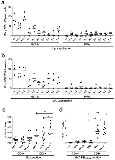 Using these peptides for the stimulation of splenoctyes from MVA-MERS-N vaccinated mice, we obtained the highest numbers of IFN-γ producing T cells with peptide 10.2 (mean levels of 94 to 97 SFC/106 splenocytes), while the other peptides (10.1, 9.1, 9.2, 9.3, 8.1, 8.2, 8.3, 8.4) induced weaker responses with a mean of 5–76 IFN-γ SFC/106 splenocytes (Figure 5a,b).