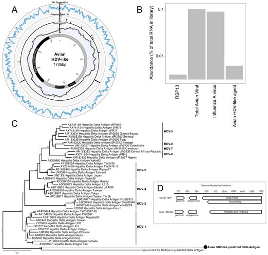 Characteristics of the genome of an avian hepatitis delta virus (HDV)-like agent. (A) Avian HDV-like agent genome, annotated with ORFs, genomic, and antigenomic ribozyme sites. Metadata rings include the read coverage, proportion of polymorphisms in reads, followed by GC content. (B) Abundance of transcripts in the metatranscriptomic library. Total avian viral abundance was dominated by that of the influenza A virus. However, the abundance of HDV is higher than that of Ribosomal protein S13 (RPS13), a stably expressed reference gene in Mallards (Anas platyrhynchos). (C) Maximum likelihood phylogeny of the HDAg protein. Representative human HDAg sequences fall into the currently described clades HDV1-8 (5). The scale bar represents the number of amino acid substitutions per site. The phylogeny is rooted between the human and avian/snake viruses. (D) Location of genomic and antigenomic ribozyme sequences, and the predicted ORF of the delta antigen in the avian HDV-like genome compared to their location in the HDV genome sequence (GenBank accession X04451.1).