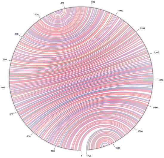 A circle graph showing the base pairing of the circular RNA genome structure of the avian HDV-like agent into an unbranched rod-like structure. The circle circumference represents the genome sequence, and the arcs represent the base pairing. Colouring of arcs: Red for G-C pairing, blue for A-U pairing, green for G-U pairing, and yellow for other types of pairings.