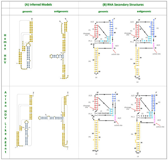 HDV ribozymes. (A) Secondary structures of the genomic and antigenomic ribozymes inferred using the TT2NE algorithm. The HDV ribozyme models were used as reference to screen for the ribozyme sequences in the avian HDV-like genome sequence. (B) Re-drawn secondary structures of the genomic and antigenomic ribozymes based on the secondary structures shown in the review by Webb and Luptak (21).