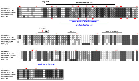 - Lazinski, D.W.; Taylor, J.M. Relating structure to function in the hepatitis Delta virus antigen. J. Virol. 1993, 67, 2672–2680. [Google Scholar] [PubMed]