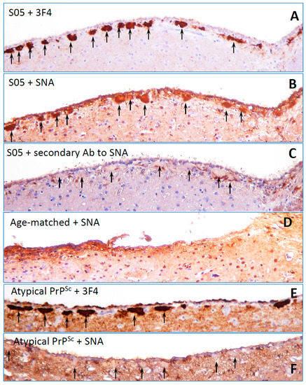 Staining of PrPSc plaques with SNA lectin. Images of SO5 PrPSc plaques (A–C) or atypical PrPSc plaques (E,F) in hamster brains stained with anti-PrP 3F4 antibody (A,E), SNA lectin (B,F), or secondary antibody used for SNA staining as negative control (C). Plaques are shown by arrows. Staining of normal age-matched control with SNA lectin is shown in (D). Brains fixed in 10% neutral buffered formalin were treated with 95% formic acid for 1 h before embedding in paraffin wax and sectioning into 4 µm sections. After a standard rehydration procedure, slides were submerged in 10 mM tri-sodium citrate buffer, pH 6.0, boiled for 5 min by microwaving at 20% power, and cooled for 1 h before proceeding with lectin staining. Incubation in 3% hydrogen peroxide in methanol for 20 min was used to remove endogenous peroxidase activity. After 5 min wash in running water, slides were incubated for 1 h with 5 µg/mL biotin-labeled elderberry bark lectin (SNA, Vector laboratories, Burlingame, CA) diluted in lectin buffer, pH 7.6 (50 mM Tris, 150 mM NaCl, 1 mM MgCl2, 0.75 mM CaCl2). Following triple 5 min wash in lectin buffer, the slides were incubated for 30 min in 5 µg/mL horse radish peroxidase-labeled streptavidin (Thermo Fisher scientific, Waltham, MA), then again washed three times with lectin buffer, and developed with 3,3’ Diaminobenzidine (DAB) Quanto chromogen and substrate (VWR, Radnor, PA).
