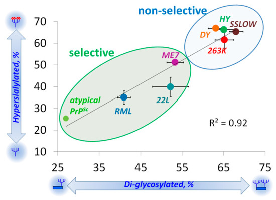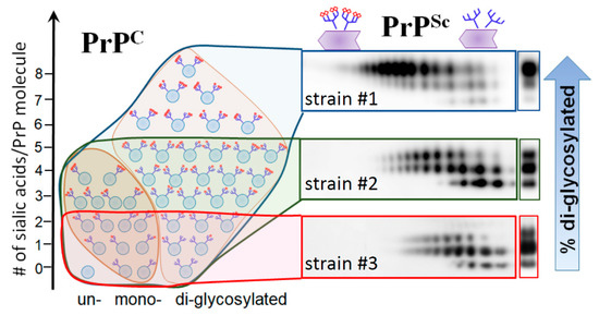 Analysis across all strains examined revealed a great correlation between the glycosylation and sialylation status within PrPSc (Figure 3) [37]. This analysis also demonstrated a broad range of selectivity displayed by prion strains in recruiting PrPC sialoglycoforms, ranging from non-selective to highly selective (Figure 3). Notably, for the group of non-selective strains, the composition of sialoglycoforms within PrPSc was very similar to that of PrPC.