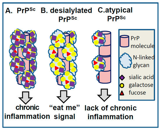 Another example that might shed light on the relationship between PrPSc molecular features and neuroinflammation deals with a unique PrPSc-like state that has substantially reduced both glycosylation and sialylation levels (will be referred to as atypical PrPSc) [27,40,66]. Atypical PrPSc is a self-replicating transmissible state [28,67,68], which accumulates in the form of small synaptic deposits and large plaques [66]. Yet, it is a clinically silent state that does not cause neuronal death, pathological lesions or any detectible clinical signs of the prion diseases [27,28,40,66,67]. Remarkably, atypical PrPSc recruits mono- and un-glycosylated PrPC of a host, while strongly excluding di-glycosylated and sialylated PrPC molecules [28] (strain #3 in Figure 2, and Figure 3). In fact, out of ten strains tested, atypical PrPSc had the lowest glycosylation and sialylation status [28,37]. Staining with SNA confirmed that sialylation levels of atypical PrPSc is significantly lower relative to those of conventional PrPSc or brain sialoglycocalyx (Figure 1E,F). Yet, unlike desialylated PrPSc, atypical PrPSc does not expose terminal galactose at high density, which is considered to be an “eat me” signal (Figure 6). As a result, it replicates and accumulates steadily in CNS. Atypical PrPSc lacks toxicity and does not case neuroinflammation [66], features that appear to be attributed to its unique glycosylation and sialylation status.