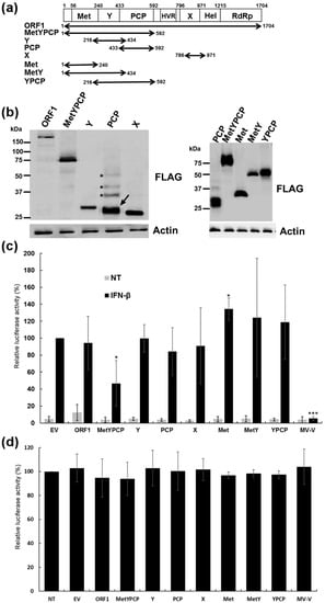 To assess the ability of the different HEV ORF1 products to interfere with the IFN-I response, we first examined their effect on ISRE promoter activation using a luciferase reporter assay. For this, 293T cells were transfected with an ISRE-reporter plasmid (pISRE-Luc), a control vector (pCMV-Luc) to normalize for transfection and a pCINeo-3xFLAG empty vector or plasmids coding for ORF1, MetYPCP, Y, PCP or X. Cells were treated 40 h later with IFN-β for 7 h. As a positive control, cells were transfected with a plasmid coding for the V protein of the Schwarz strain of measles virus (MV-V) fused to a FLAG tag at its amino-terminal. This viral protein inhibits the IFN-I response by interacting with STAT1 and JAK1 and interfering with STAT1 and TYK2 phosphorylation []. As shown in Figure 1c and Supplementary Materials Table S1, the expression of MetYPCP was able to inhibit significantly ISRE promoter activation after stimulation with IFN-β. This inhibition was not due to a cytotoxic effect of the viral protein, as transfection of the construct coding for MetYPCP for 40 h did not affect cell viability (Figure 1d). The MetYPCP inhibitory effect on the ISRE promoter was modest compared to the one of MV-V. This might have been due to the low expression level of MetYPCP in our reporter assay (Supplementary Materials Figure S1). In contrast, no significant inhibition was detected when PCP alone was expressed. It is interesting to note that both MetYPCP and PCP were able to inhibit significantly IFN-β promoter activity after stimulation of the RLR pathway in a luciferase reporter assay []. This result was in agreement with previous findings showing that PCP from HEV-1 ORF1 was an inhibitor of the RLR pathway [] and suggested that the PCP domain expressed in our study was functional. ORF1 had no impact on ISRE promoter activation in our assay, but the relatively low expression of full-length ORF1 or a lack of processing of the polyprotein in 293T cells (Figure 1b and Supplementary Materials Figure S1) might have masked a putative inhibitory effect. To determine whether the entire MetYPCP product was necessary to inhibit ISRE promoter activation, we also tested the effect of Met, MetY and YPCP of HEV ORF1 on ISRE promoter activity using the same luciferase reporter assay (Figure 1a–c, Supplementary Materials Figure S1 and Table S1). As shown in Figure 1c, expression of Met alone resulted in a significant increase in ISRE promoter activation, and MetY or YPCP had no effect on ISRE promoter activation. These results suggested that expression of the amino-terminal region of ORF1 containing the Met, Y and PCP domains was necessary to inhibit the signalling pathway triggered by IFN-I.