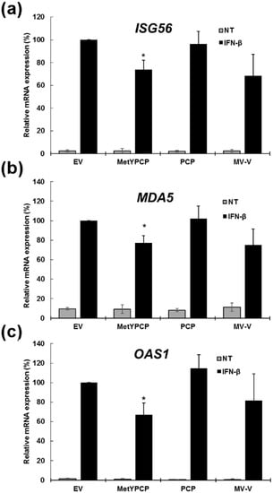 Expression of MetYPCP of HEV ORF1 downregulated mRNA levels of several ISGs following IFN-β treatment. (a–c) Here, 293T cells were transfected with a pCINeo-3xFLAG empty vector or a plasmid coding for MetYPCP, PCP or MV-V fused to a 3xFLAG tag. Forty hours post-transfection, cells were stimulated or not (NT) with 500 IU/mL of IFN-β for 6 h. Total RNA was extracted, and expression of the mRNA coding for (a) ISG56, (b) melanoma differentiation-associated protein (MDA)5 and (c) 2′,5′-oligoadenylate synthetase (OAS)1 were measured by RT-qPCR. Glyceraldehyde 3-phosphate dehydrogenase (GAPDH) was used as a reference gene. Relative mRNA expression was calculated for each condition and is presented as percentages of the treated EV control (± standard deviations). Results shown represent the mean of three independent experiments performed in triplicate: *, p < 0.05 compared to EV control for treated samples (unequal variance t-tests). Results from the three independent experiments are presented in Supplementary Materials Figure S2.