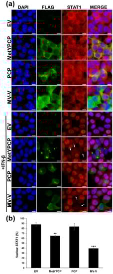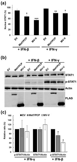 We then wanted to determine whether MetYPCP had the ability to inhibit the JAK/STAT pathway in response to IFN-II. As IFN-I and -II activation triggers different components of the JAK/STAT pathway, these experiments could help pinpoint at which level of the pathway MetYPCP was acting. First, we assessed the effect of MetYPCP expression on STAT1 nuclear translocation after IFN-γ stimulation by immunofluorescence (Figure 5a and Supplementary Materials Figure S4). IFN-γ treatment led to the nuclear translocation of STAT1 in around 96% of cells transfected with an empty vector and around 80% of cells expressing MetYPCP (Figure 5a), thus suggesting that MetYPCP was able to inhibit STAT1 translocation in response to IFN-γ. However, this antagonist effect was less pronounced than the one observed after IFN-β treatment, for which 68% of cells expressing MetYPCP displayed a predominant localization of STAT1 in the nucleus (Figure 5a). We also assessed the ability of MetYPCP to inhibit STAT1 phosphorylation after IFN-II treatment. Cells expressing MetYPCP were treated with IFN-γ for 30 min, and the level of phosphorylated STAT1 was quantified by immunoblotting. As shown in Figure 5b,c, no significant inhibition of STAT1 phosphorylation was detected in cells expressing MetYPCP following IFN-γ treatment. These results suggested that MetYPCP had a limited impact on the JAK/STAT pathway after IFN-II treatment. Similarly to MetYPCP, MV-V caused a slight decrease of STAT1 translocation (Figure 5a) and did not inhibit STAT1 phosphorylation (Figure 5b,c) after IFN-γ treatment. These results were in agreement with several studies showing that MV-V was more efficient at antagonizing the response to IFN-I in comparison to IFN-II [,,].
