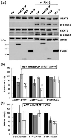 To investigate which step of the JAK/STAT pathway was targeted by MetYPCP, we then assessed the phosphorylation status of STAT1 after IFN-β treatment by immunoblot analysis in 293T cells expressing MetYPCP or PCP. Cells expressing MV-V were used as positive controls. As shown in Figure 4a,b, the level of phosphorylated STAT1 detected after IFN-β treatment was reduced significantly in 293T cells expressing MetYPCP in comparison to cells transfected with an empty vector or expressing PCP. No change in the total level of STAT1 was observed in cells expressing MetYPCP, indicating that the viral protein did not interfere with the expression or stability of STAT1. Moreover, we also assessed the phosphorylation status of STAT2 and found that MetYPCP had no significant effect on the level of total and phosphorylated STAT2 (Figure 4a,c), suggesting that MetYPCP interfered with the activation of STAT1 but not STAT2 following IFN-I treatment.