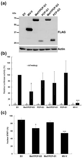 Comparison of the effect of MetYPCP from HEV-1 and HEV-3 on the Janus kinase (JAK)/STAT pathway. (a) Expression of FLAG-tagged MetYPCP and PCP from a strain of HEV-1 (MetYPCP-G1 and PCP-G1) and HEV-3 (MetYPCP-G3 and PCP-G3) in 293T cells detected by immunoblotting using an anti-FLAG antibody. Actin served as a loading control. Cells were lysed 24 h post-transfection. (b) Effect of MetYPCP and PCP from HEV-1 and HEV-3 on ISRE promoter activation: 293T cells were transfected with pISRE-Luc, pCMV-Luc and a pCINeo-3xFLAG empty vector or a plasmid coding for MV-V, MetYPCP-G1, MetYPCP-G3, PCP-G1 or PCP-G3. Forty h later, cells were treated or not (NT) with IFN-β for 7 h and lysed to determine firefly and Renilla luciferase activities. Mean ratios between firefly and Renilla luciferase activities were calculated and are presented as percentages of the treated EV control (± standard deviations). Results shown represent the mean of five independent experiments performed in triplicate: * p < 0.05; *** p < 0.0005 compared to the EV control for treated samples (unequal variance t-tests). Raw data are presented in Supplementary Materials Table S2. (c) Here, 293T cells were transfected with a pCINeo-3xFLAG empty vector or a plasmid coding for MetYPCP-G3, MetYPCP-G1 or MV-V fused to a 3xFLAG tag. Twenty-four hours post-transfection, cells were stimulated for 30 min with 1000 IU/mL of IFN-β. Cells were then washed, fixed and stained with primary antibodies raised against STAT1 and FLAG, followed by fluorescent dye-conjugated secondary antibodies. STAT1 localization was determined in 70 to 117 cells expressing the corresponding FLAG-tagged protein (except for the EV control, for which 311 to 328 cells were randomly assessed). The mean percentage (± standard deviation) of cells showing a predominant nuclear localization of STAT1 from three independent experiments is shown: * p < 0.05; *** p < 0.0005 compared to the EV control for treated samples (unpaired t-tests).