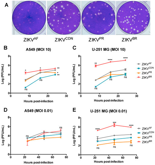 We first sought to determine the viral growth kinetics for each of the four ZIKV isolates (Figure 1B–E). Viral titers were assessed using both one-step and multi-step growth curves after infection at an MOI of 10 and 0.01, respectively (Figure 1B–E). At MOI of 10, ZIKVBR grew to significantly higher titers at 8 h post-infection in both cell types, suggesting that ZIKVBR has an advantage in terms of growth kinetics (Figure 1B,C). In A549 cells, the increased titer of ZIKVBR was much less pronounced by 24 h post-infection, at which time the titers of the other isolates have nearly caught up to within 1-log of ZIKVBR (Figure 1B). In contrast, in U-251 MG cells, ZIKVBR continues to replicate to significantly higher titers than all other isolates at all time points post-infection, even when titers have begun to plateau by 24 h post-infection (Figure 1C). Interestingly, the ZIKVBR titers are already increasing by 8 h post-infection, whereas titers for the other isolates do not increase until after 8 h post-infection based on titers at 0 h [37]. Overall, this suggests that ZIKVBR replicates to higher titers in U-251 MG cells, with faster replication kinetics over a single infectious cycle.