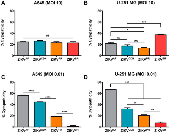 ZIKV isolates elicit different cytopathic effects in A549 and U-251 MG cell lines. (A) A549 and (B) U-251 MG cells were infected with ZIKV at MOI = 10 and cell viability was determined by MTT assay at 24 h post-infection. (C) A549 and (D) U-251 MG cells were infected with ZIKV at MOI = 0.01 and cell viability was determined by MTT assay 72 h post-infection. % Cytopathicity = 100% − ((Uninfected Absorbance − Infected Absorbance)/(Uninfected Absorbance) × 100%). Values represent the mean ± SEM of three independent experiments. Asterisks indicate significant differences in % cytopathicity: * p < 0.05, ** p < 0.01, *** p < 0.001, **** p < 0.0001.