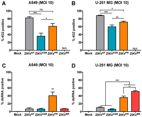 Due to the discrepancies in CPEs elicited at different MOIs, we set out to determine the percent of ZIKV-infected cells at high and low MOI using flow cytometry (Figure 3 and Figure S3). We initially determined the % infected cells by staining for the envelope glycoprotein using a pan-flavivirus (4G2) antibody (Figure 3A,B). At MOI 10, ZIKVCDN infected a lower proportion of A549 cells (36%) when compared to ZIKVAF (82%) and ZIKVPR (61%) at 24 h post-infection (Figure 3A). A similar trend was observed in the U251-MG cells, where ZIKVAF, ZIKVCDN, and ZIKVPR infected 88%, 60%, and 72% of cells, respectively (Figure 3B). However, we were unable to detect ZIKVBR using the envelope antibody in either cell line. Given that viral epitopes may have changed over the course of the viral evolutionary history, we stained for dsRNA as a marker for active viral replication, to ensure similar sensitivity of detection across all isolates. At MOI 10, we detected significantly more dsRNA in a higher proportion of A549 cells during ZIKVPR infection (40%), whereas only approximately 7% of A549 cells were dsRNA-positive in the other three isolates (ZIKVAF, ZIKVCDN, and ZIKVBR) at 24 h post-infection (Figure 3C). In the U251-MG cells, the rate of infection was similar to that in A549 cells for ZIKVAF and ZIKVCDN, with approximately 10% and 6% dsRNA-positive cells, respectively (Figure 4D). However, for both the contemporary isolates (ZIKVPR and ZIKVBR), a significantly higher percentage of cells were dsRNA-positive in U-251-MG cells, with approximately 36% and 51% dsRNA-positive cells, respectively (Figure 3D). These results suggest that ZIKVPR may induce more viral RNA replication (as indicated by dsRNA staining) than ZIKVAF and ZIKVCDN, since all three isolates display a similar % of infected cells when staining for the viral envelope, but vastly different amounts of dsRNA-positive cells. This may also be true for ZIKVBR, which had a similar percentage of dsRNA-positive cells; however, we were not able to assess the % infected cells for this isolate using the envelope antibody. Taken together, these results suggest that over a single infectious cycle, ZIKVPR infection results in a greater proportion of dsRNA-positive cells in both cell types, while ZIKVBR selectively induces more dsRNA-positive cells in U-251 MG cells.